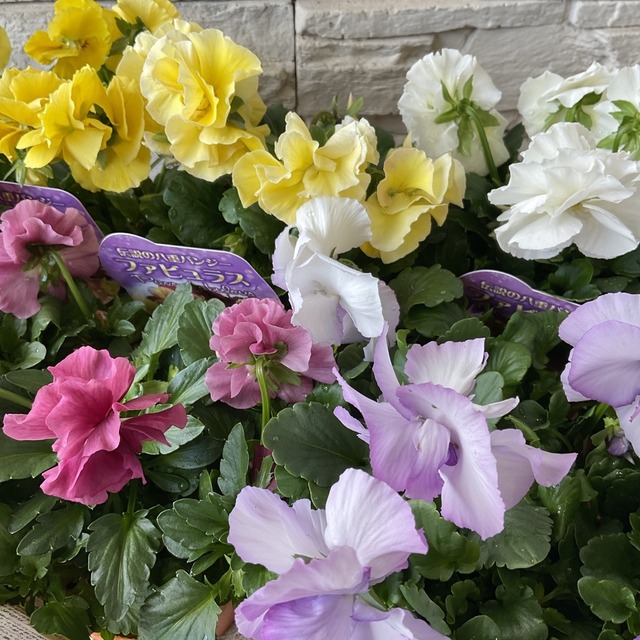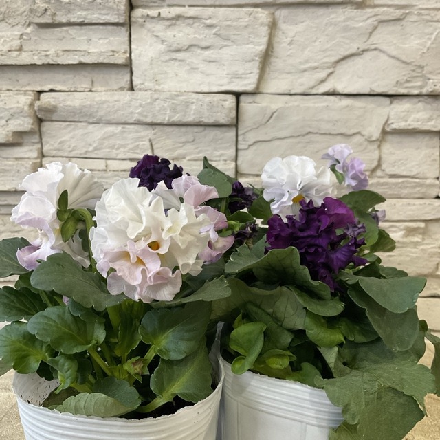 【商品名】八重パンジー ファビュラス 3.5寸ポット 【分類】一年草 【開花期】11月~5月 【草丈】20~30cm前後 *草丈は、参考にしていただく一般的なサイズで土地や育て方によって異なります。 【管理場所】日当たりの良いところ 【鉢の大きさ】3.5寸ポット 【色】4種類のカラーからお選びください ・ホワイト系 ・ピンク系 ・イエロー系 ・パープル系 *お色の濃淡、個体差がございますがご了承ください 寒さに強い多彩な花です。 *画像は、イメージで現品のお届けとは限りません。 *植物の成長や季節によっては、開花していなかったり、お花や葉がついていない状態でのお届けもあります。ご了承ください。 【育て方】 日当たりの良い場所で管理してください。 土の表面が乾いたらたっぷりお水を与えてください。 こちらは1ポットずつの販売です。 ※植物ですので個体差がございます。 *植物は日々成長しております。 花苗は商品画像の状態と大きく変化がある場合、メールにてご連絡を差し上げる場合がございます。メール拒否設定などでご連絡がつかない場合、こちらからキャンセルさせていただくことがございますのでご了承くださいませ。 在庫管理には気をつけてはおりますが、店頭でも同時販売しておりますのでご注文いただいた後、店頭で売り切れている場合、キャンセルをお願いする場合がございます。 ご了承くださいませ。 【贈り物としてご購入のお客様へ】 植物の状態は日々変化します。お花がお休みしているものや剪定したばかりのものなど状態は様々ですので、花苗や鉢物を贈り物としてご注文をされる際は植物の特性なども考慮の上ご検討ください。 【ラッピング・化粧箱】 ラッピング・化粧箱(有料)をご希望の場合は、ラッピングを別途ご購入いただきお手続きください。 *ラッピングのお手続がない場合は、梱包材は環境に配慮しリサイクルのものを使用しています。 ご了承ください。