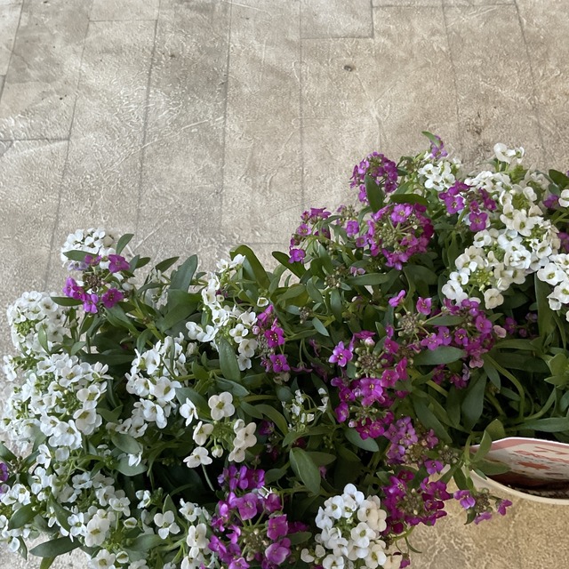 【商品名】アリッサム ミックス 植え 【分類】一年草 【開花期】周年 ※真夏と真冬は花が休むことがあります 【草丈】15cm前後 *草丈は、参考にしていただく一般的なサイズで土地や育て方によって異なります。 【管理場所】日当たりの良いところ 【鉢の大きさ】3.5寸ポット *個体差がございます。 カラフルでかわいいアリッサムのミックス植えです。 耐暑性があり育てやすく、早春から冬までほぼ周年花を楽しめます。 *画像は、イメージで現品のお届けとは限りません。 *植物の成長や季節によっては、開花していなかったり、お花や葉がついていない状態でのお届けもあります。ご了承ください。 【育て方】 日当たりと水はけの良い場所で育てます。 乾きに注意し、頻度を高めに水を与えてください。 こちらは1ポットずつの販売です。 ※植物ですので個体差がございます。 *植物は日々成長しております。 花苗は商品画像の状態と大きく変化がある場合、メールにてご連絡を差し上げる場合がございます。メール拒否設定などでご連絡がつかない場合、こちらからキャンセルさせていただくことがございますのでご了承くださいませ。 在庫管理には気をつけてはおりますが、店頭でも同時販売しておりますのでご注文いただいた後、店頭で売り切れている場合、キャンセルをお願いする場合がございます。 ご了承くださいませ。 【贈り物としてご購入のお客様へ】 植物の状態は日々変化します。お花がお休みしているものや剪定したばかりのものなど状態は様々ですので、花苗や鉢物を贈り物としてご注文をされる際は植物の特性なども考慮の上ご検討ください。 【ラッピング・化粧箱】 ラッピング・化粧箱(有料)をご希望の場合は、ラッピングを別途ご購入いただきお手続きください。 *ラッピングのお手続がない場合は、梱包材は環境に配慮しリサイクルのものを使用しています。 ご了承ください。