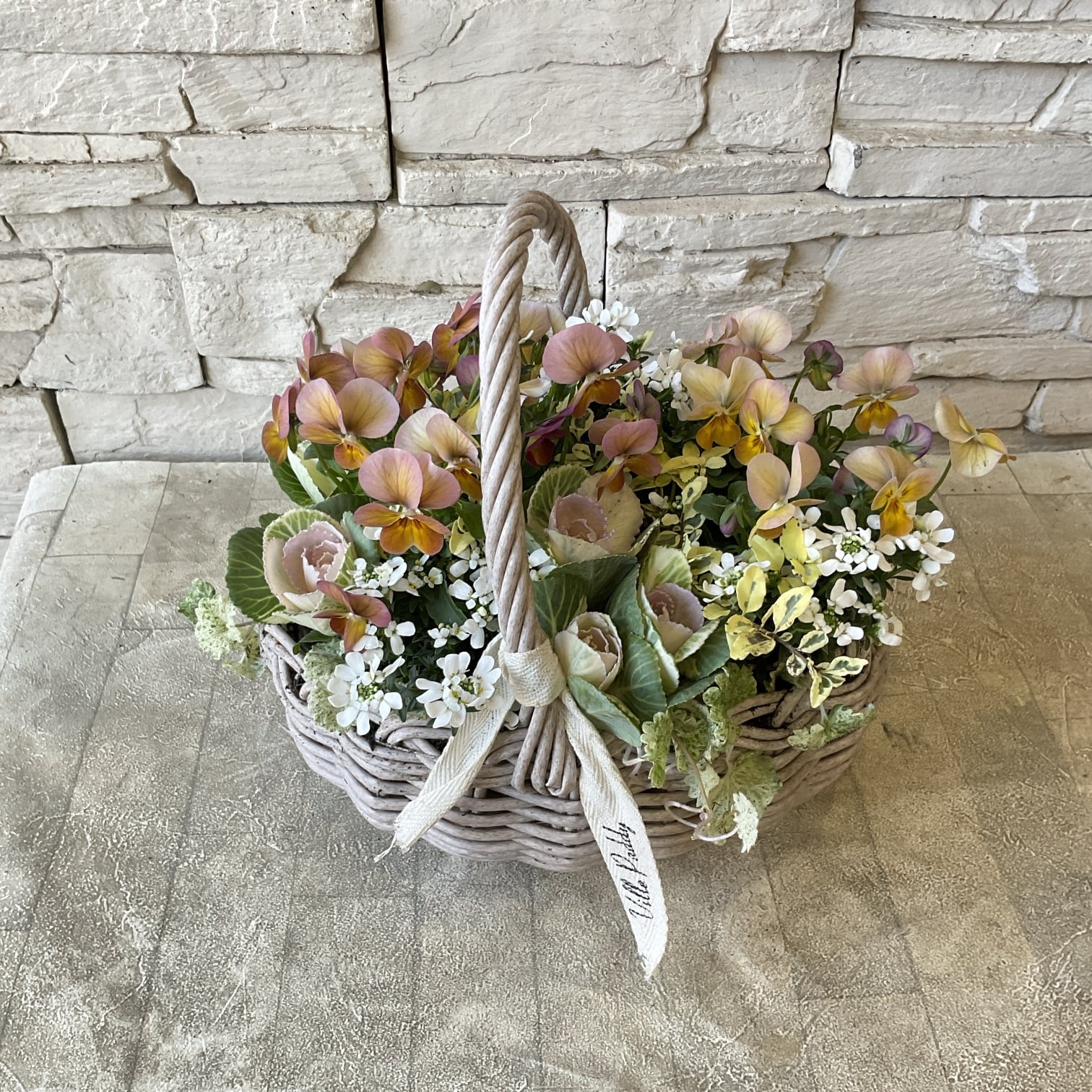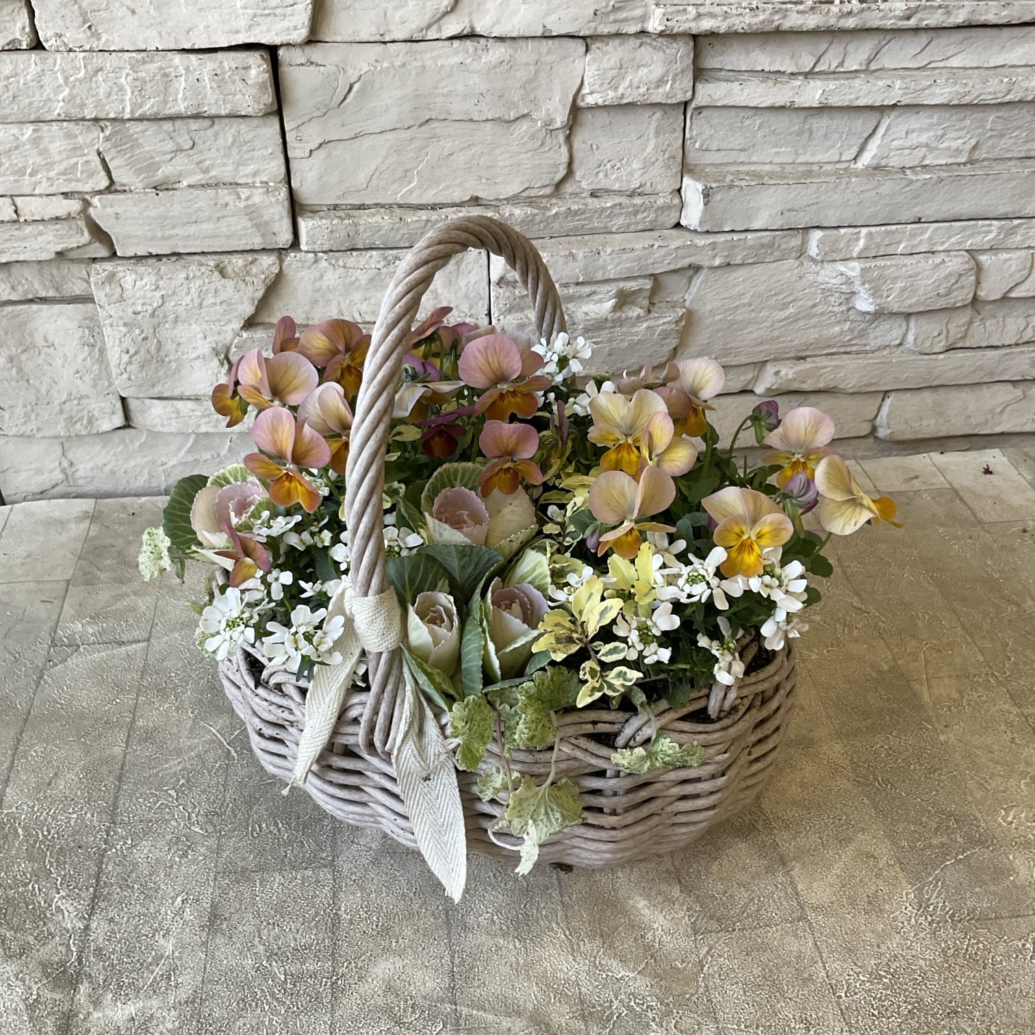 アンティークピンクのビオラとイベリスをメインにバスケットに植え込みました。