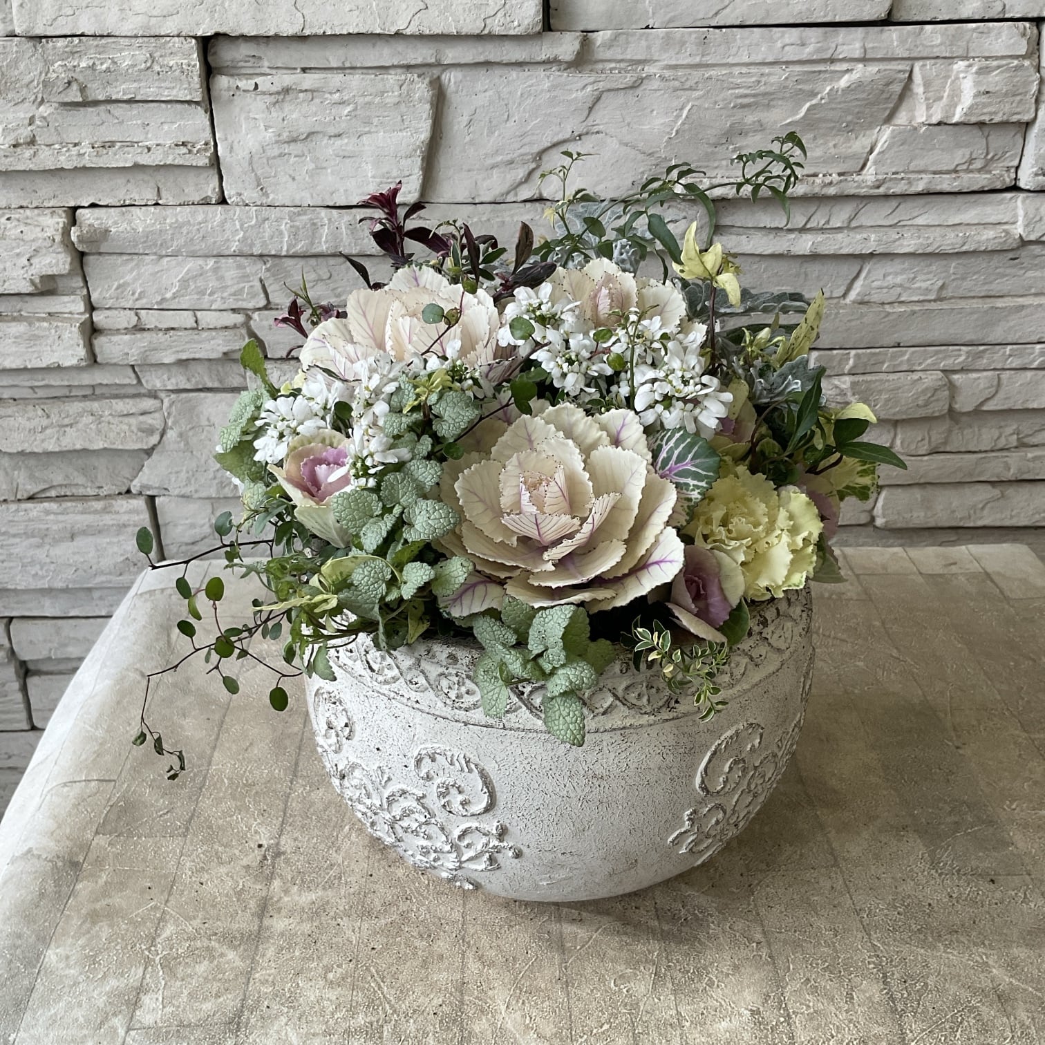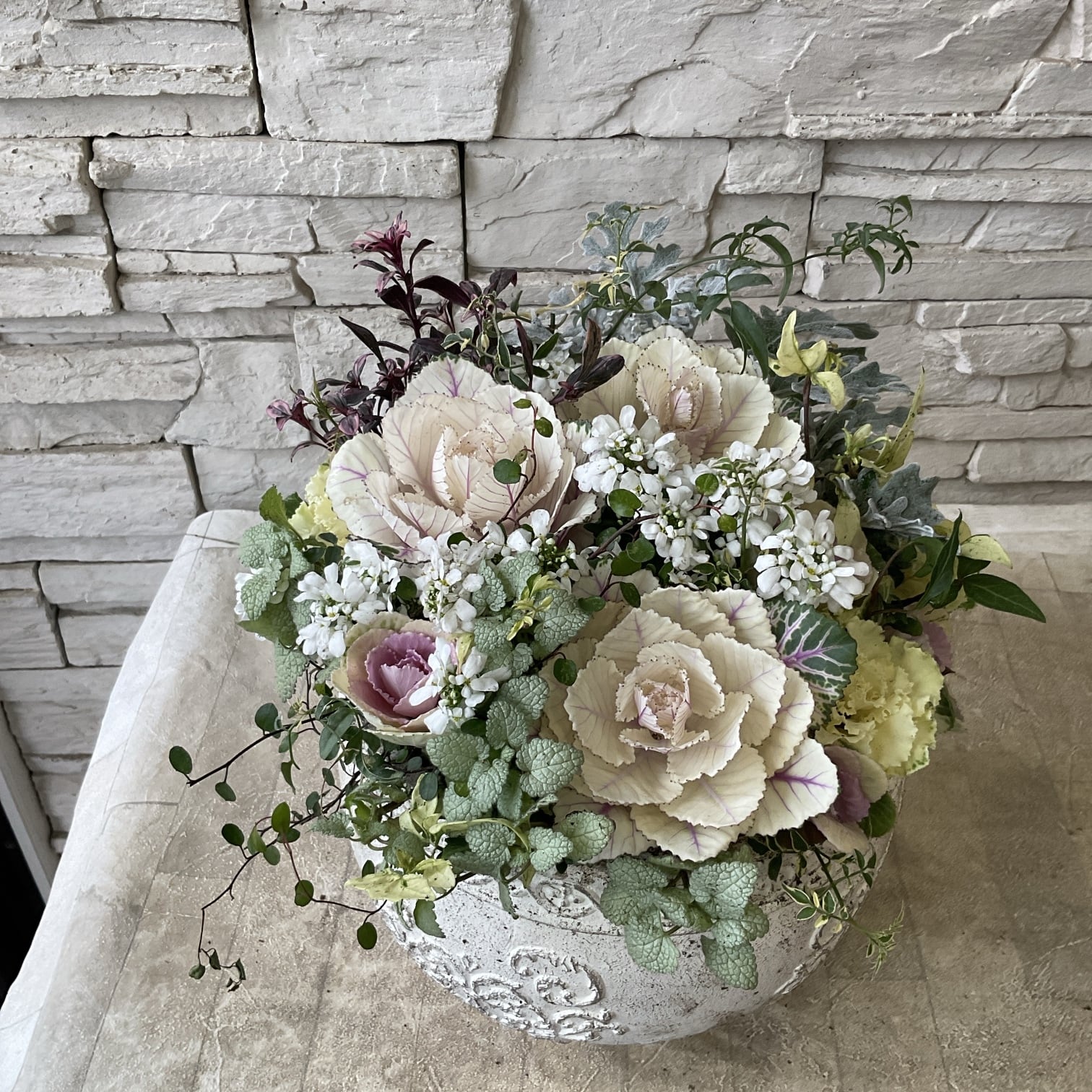 葉牡丹、イベリス、リーフ類でエレガントに。