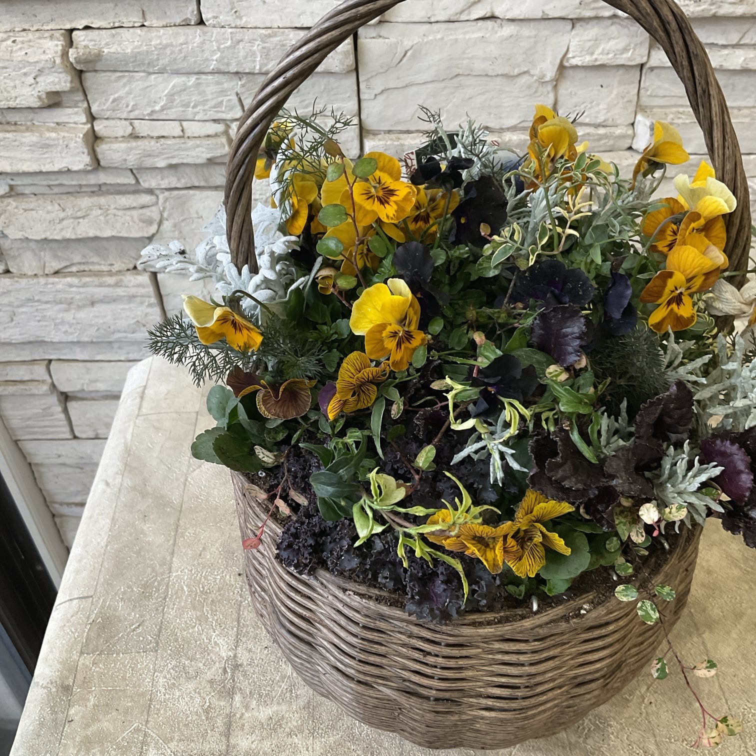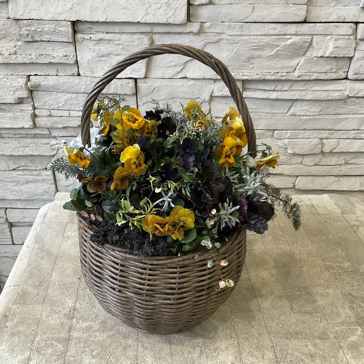 ビオラとリーフ類を使用し、ダークでシックなイエローの寄せ植えに。