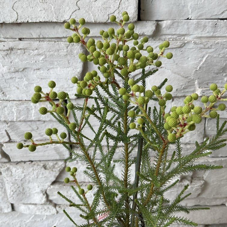 枝先に小さな球状の緑色の蕾が付き、開花すると白い丸い頭にのような花を咲かせます。