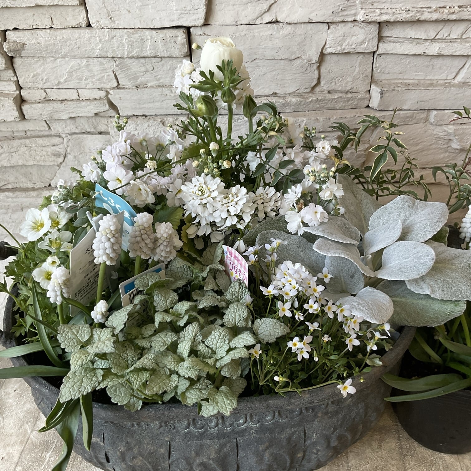 白色の小花を寄せ集めて清楚な寄せ植えに