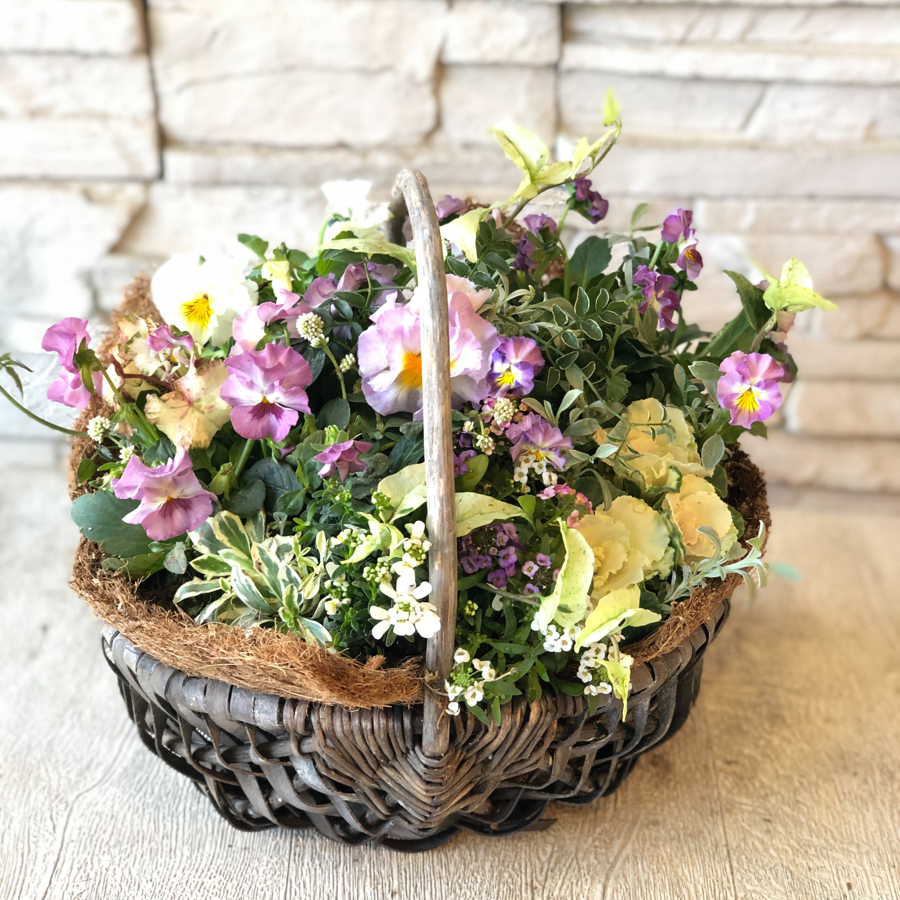 優しい色のパンジー、ビオラ、葉牡丹、アリッサムなど冬のお花をいっぱいに詰め込んだカゴギャザリング