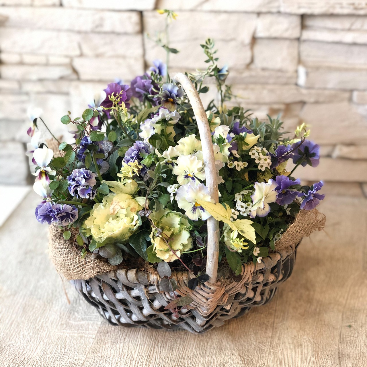 優しい色のパンジー、ビオラ、葉牡丹など冬のお花をいっぱいに詰め込んだカゴギャザリング
