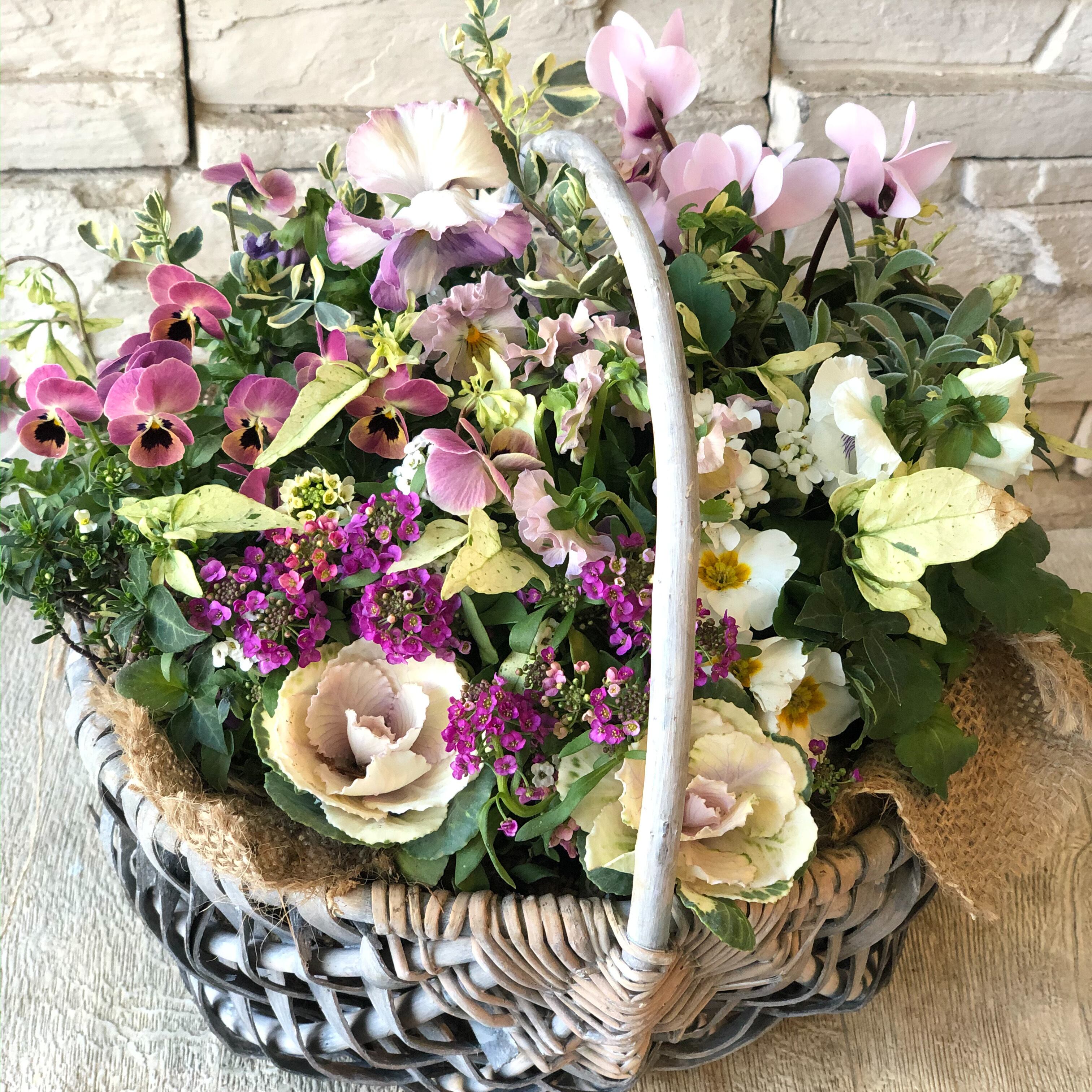 優しい色のパンジー、ビオラ、葉牡丹など冬のお花をいっぱいに詰め込んだカゴギャザリング
