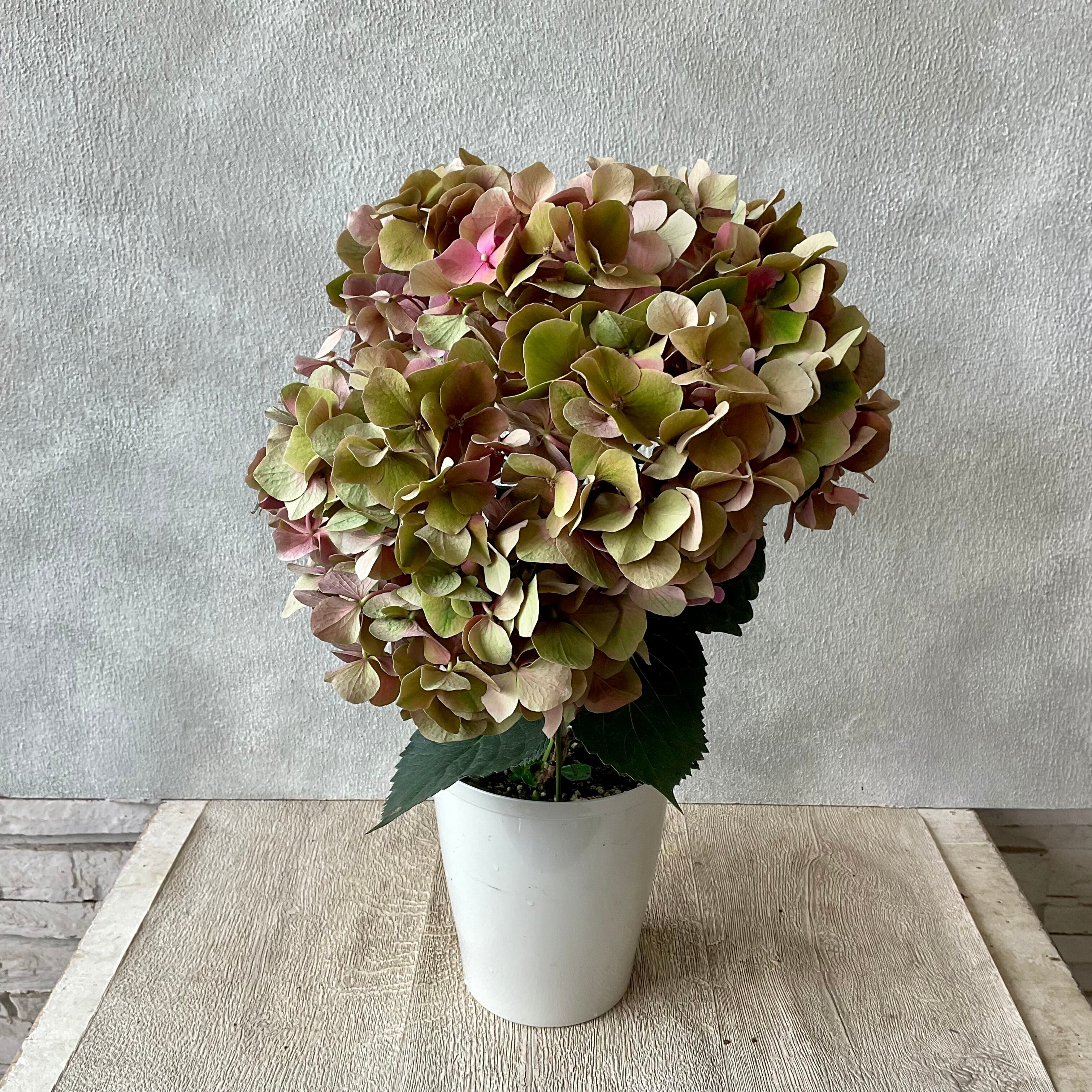かわいいピンクと趣きのあるグリーンが魅力の秋色アジサイ。