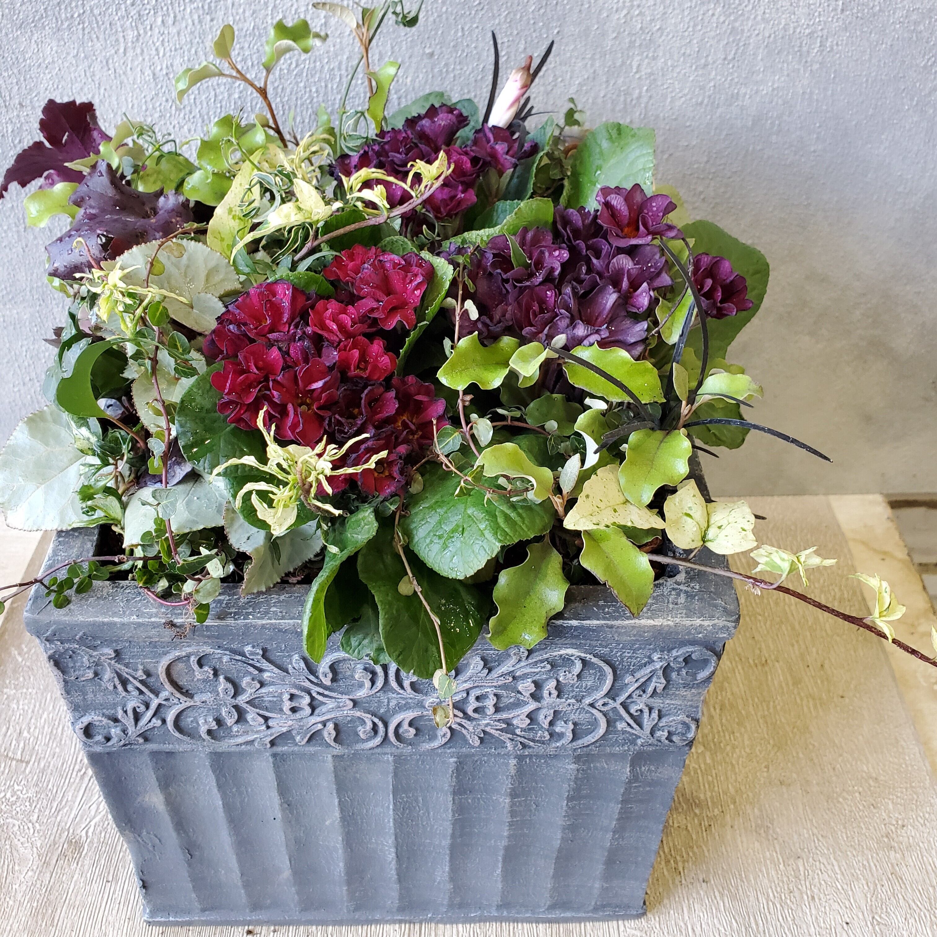 大人なレッドのプリムラと人気のグリーンをスクエアポットに集めた寄せ植え。