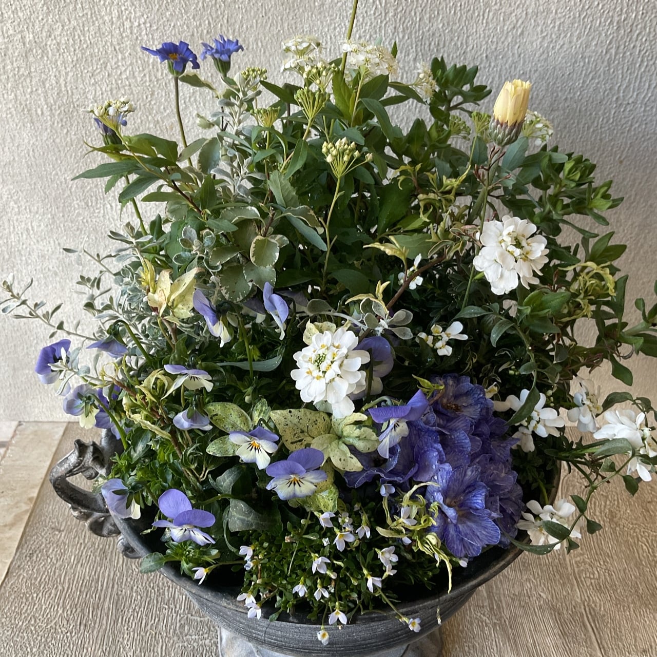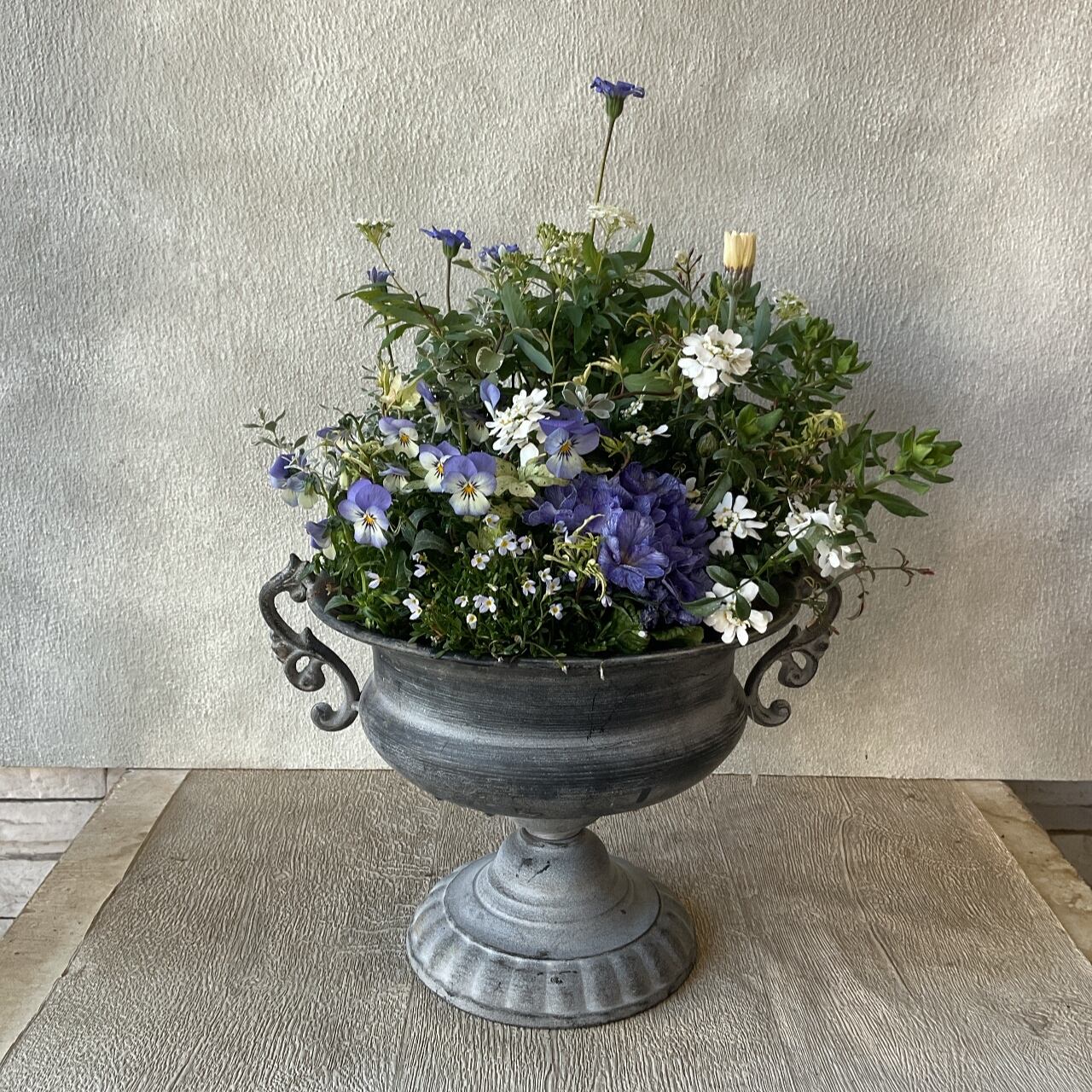 プリムラやヒナソウ、コデマリなどの春のお花と人気のグリーンをブリキポットに集めた寄せ植え。