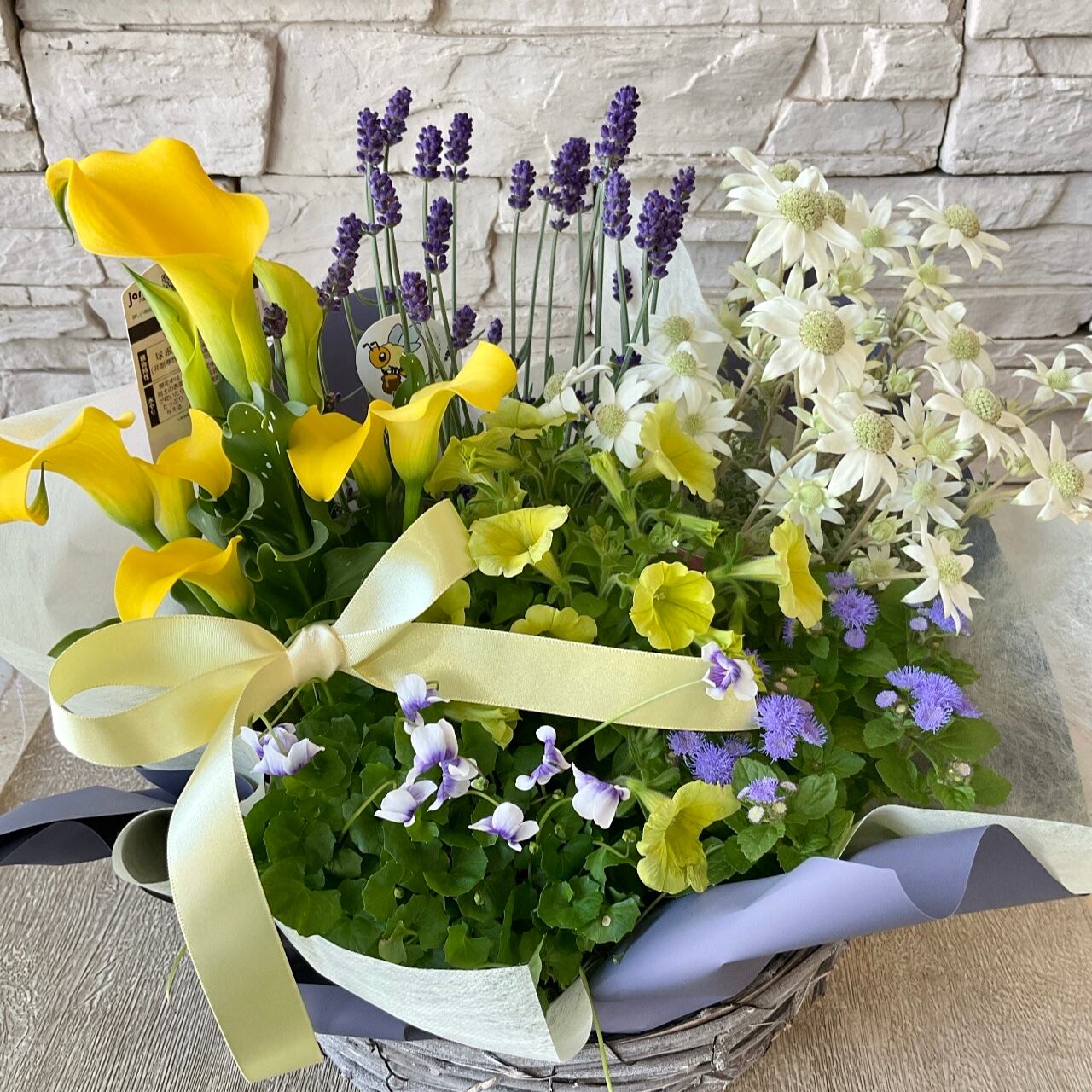 かごの中にラベンダー、カラー、フランネルフラワーなどの苗がセットされています。