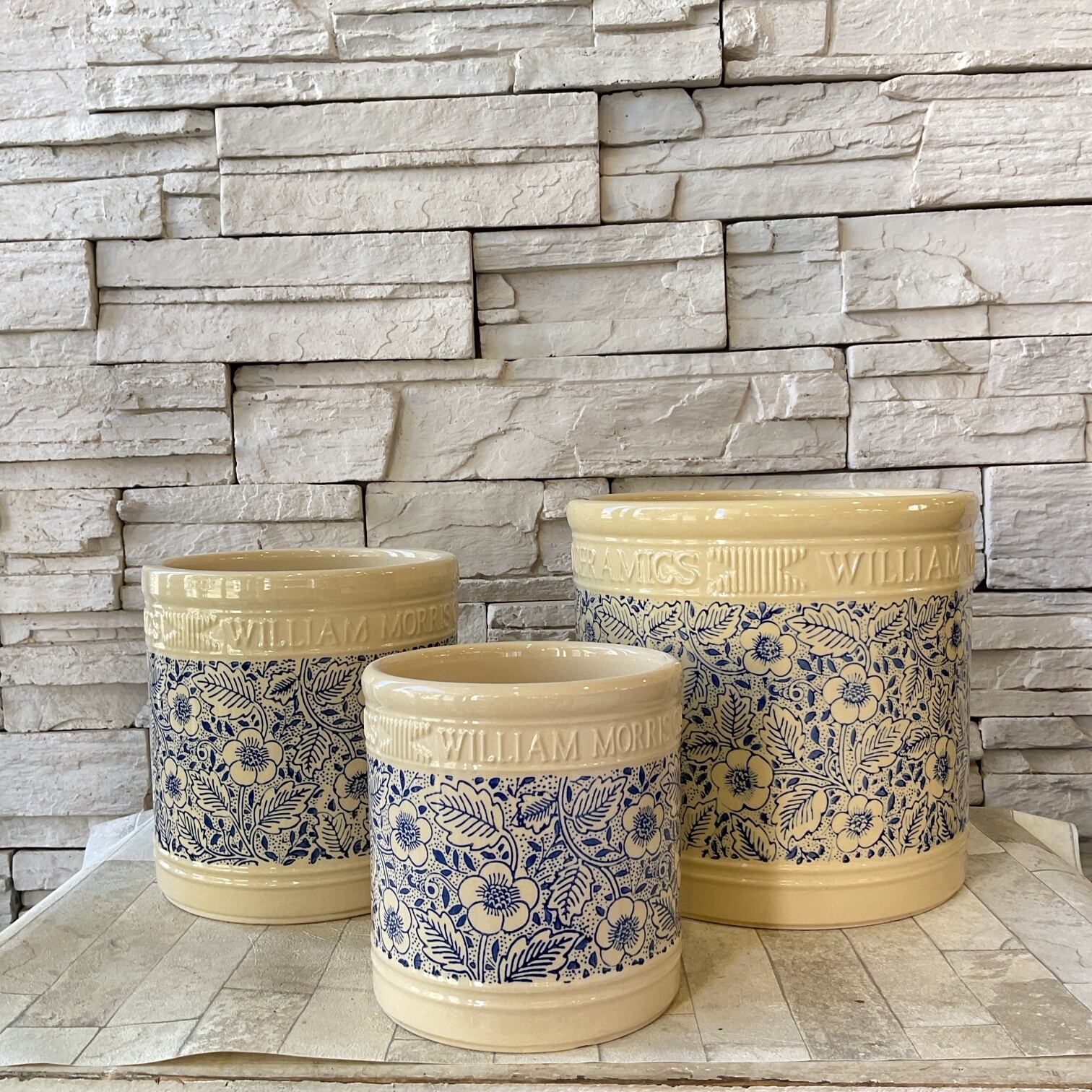 ヴィクトリア朝のイギリスでウィリアム・モリスが作り上げたCeramic(陶器)はベースがクリーム色に濃いめのブルーで繊細な柄を描いたこれまでに無い見事な職人技にてガーデンコンテナが完成しました。