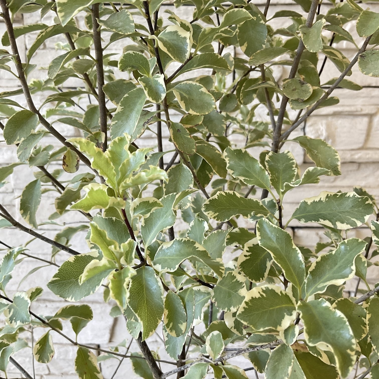白クリーム色の覆輪が入り、黒軸と緑葉のコントラストが美しいピットスポルムです。