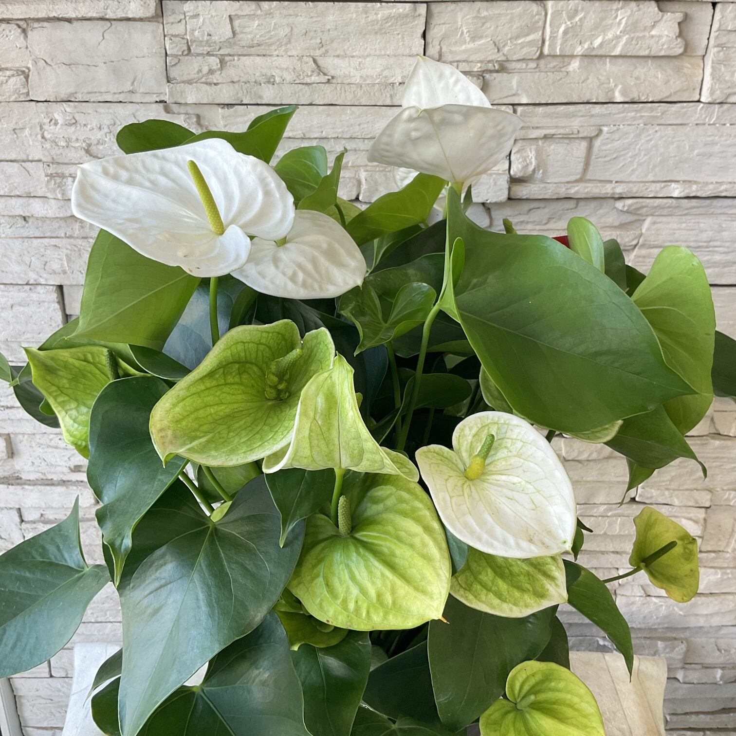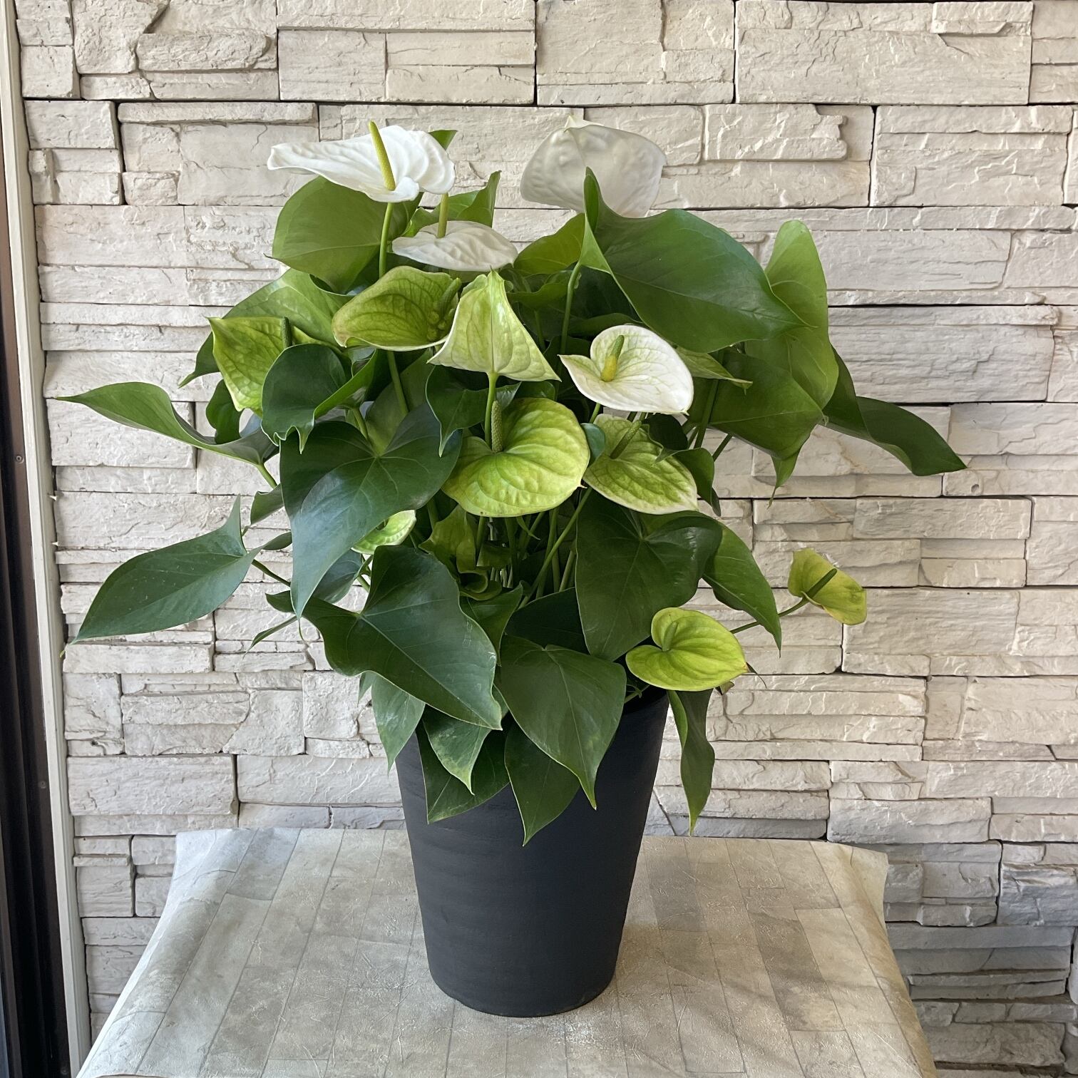 純白の花色とつややかな葉が特徴のアンスリウムです。