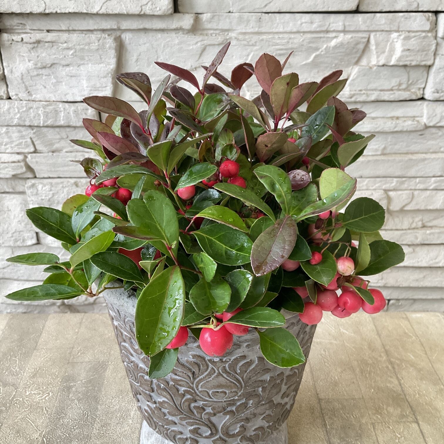 クリスマスやお正月にぴったりな紅い実によく合うシックなカップポットに植え込んだ商品です。