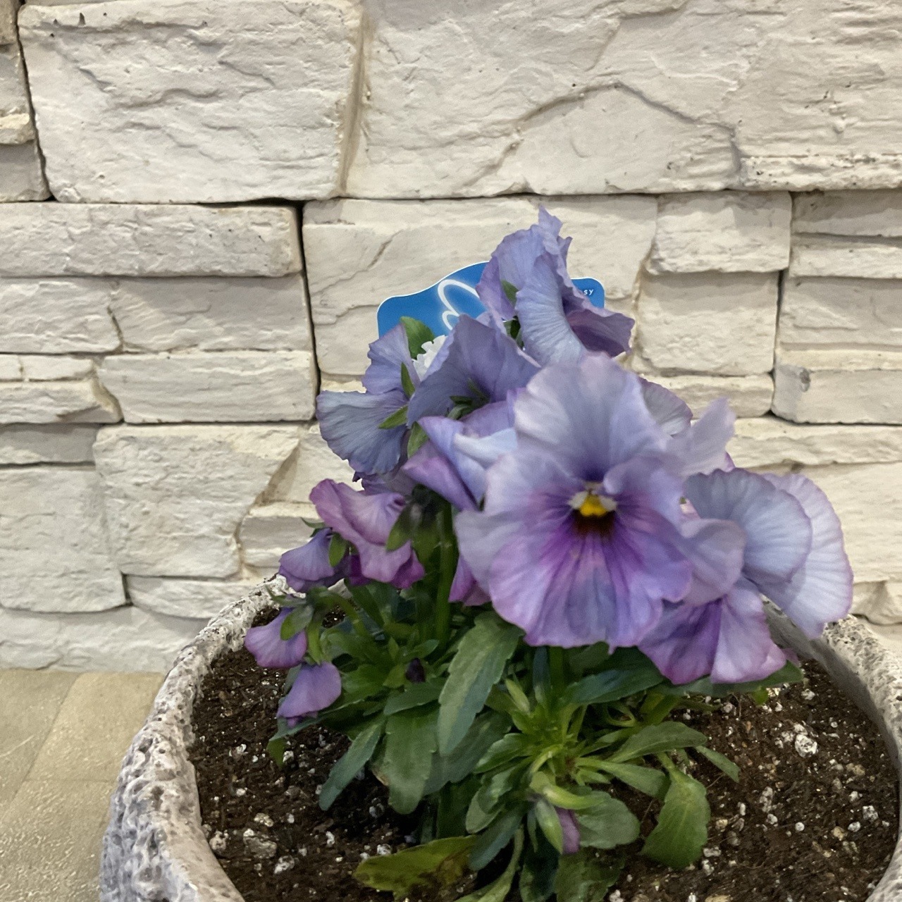 春を思わせるような優しいパステル系の品種 パンジー エール17 をお洒落ポットに植えました。