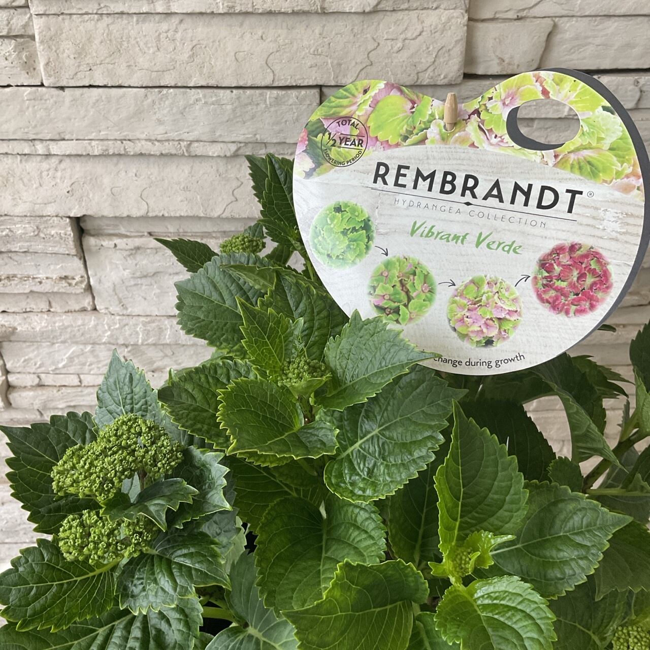 アジサイ・レンブラントシリーズはコンパクトな品種で、丈夫な茎にしっかりとした花が咲き、開花期間が長く、その間に花色が変化し季節を通して楽しめるのが特徴です。ヴィブラントヴェルデは緑色で開花が始まり、開花が進むにつれて段階的に色づいていき、花色は徐々に濃くなります。最後は花全体が見事に色づきます。