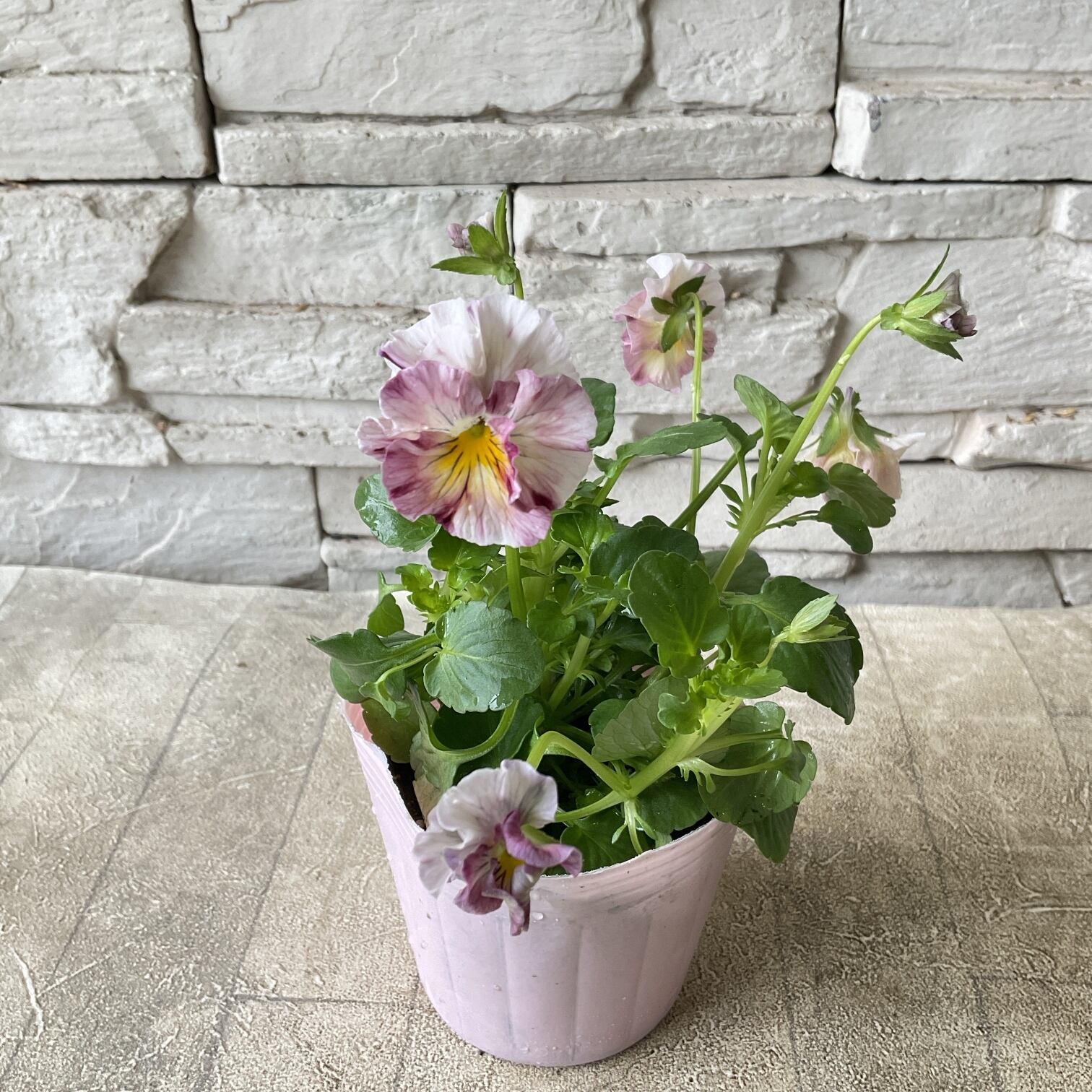 薄めのピンクパープルに紫や黄みを帯びた複雑な色合いがおしゃれなビオラです。